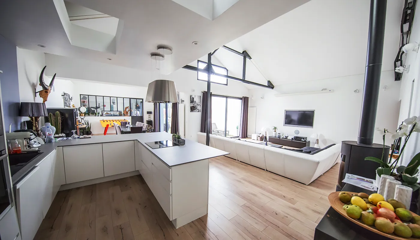 Les espaces nuits et les salles d’eau sont organisées sous forme de petits volumes fermés bas de plafonds alors que les espaces séjour cuisine et atelier sont généreux et occupent toute la hauteur jusqu’au faitage. La toiture a été complètement rénovée et à cette occasion un patio et des puits de lumières ont été créés pour apporter de la lumière naturelle.